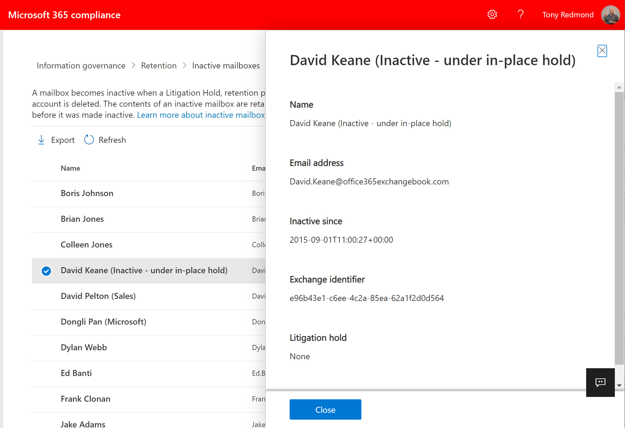 Inactive mailboxes don’t need a lot of management unless you want to recover data from an inactive mailbox or restore the inactive mailbox to a new mailbox. Apart from that, inactive mailboxes are self-managing and remain in place until the holds supporting their status expire. Note that the Managed Folder Assistant continues to process inactive mailboxes and will remove items which are not needed by the holds in place.