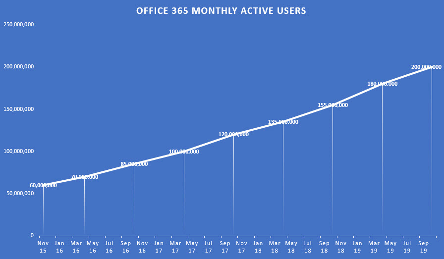 According to Microsoft’s FY20 Q1 results, Office 365 now has 200 million monthly active users. The interesting thing is that the growth has remained constant at about 3 million users per month since November 2015. Moving from 60 million users to 200 million over 4 years is impressive, but growth is probably going to become harder as the number of on-premises Microsoft customers decline.